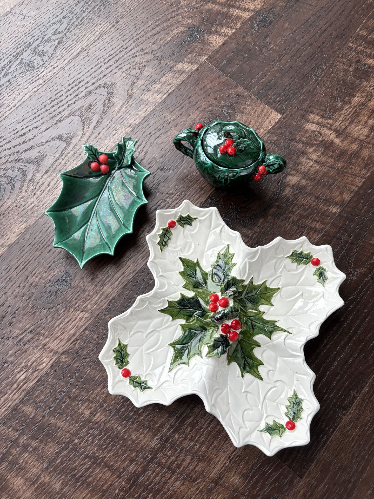 Vintage Lefton Christmas White Holly Berry Divider Plate, Green Berry Dish & Sugar Bowl