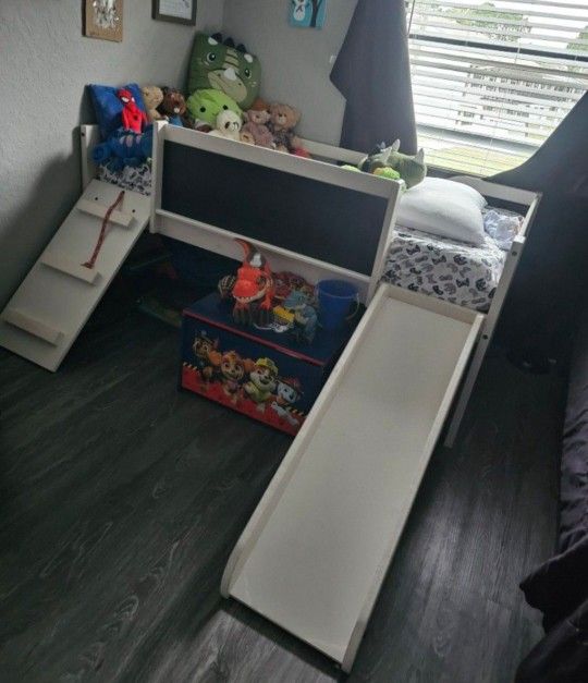 Bought this bed for my son but now it's time to change it up there is room under the bed for like a fort area my son had his chair and some toys under there also has a chalk board on it