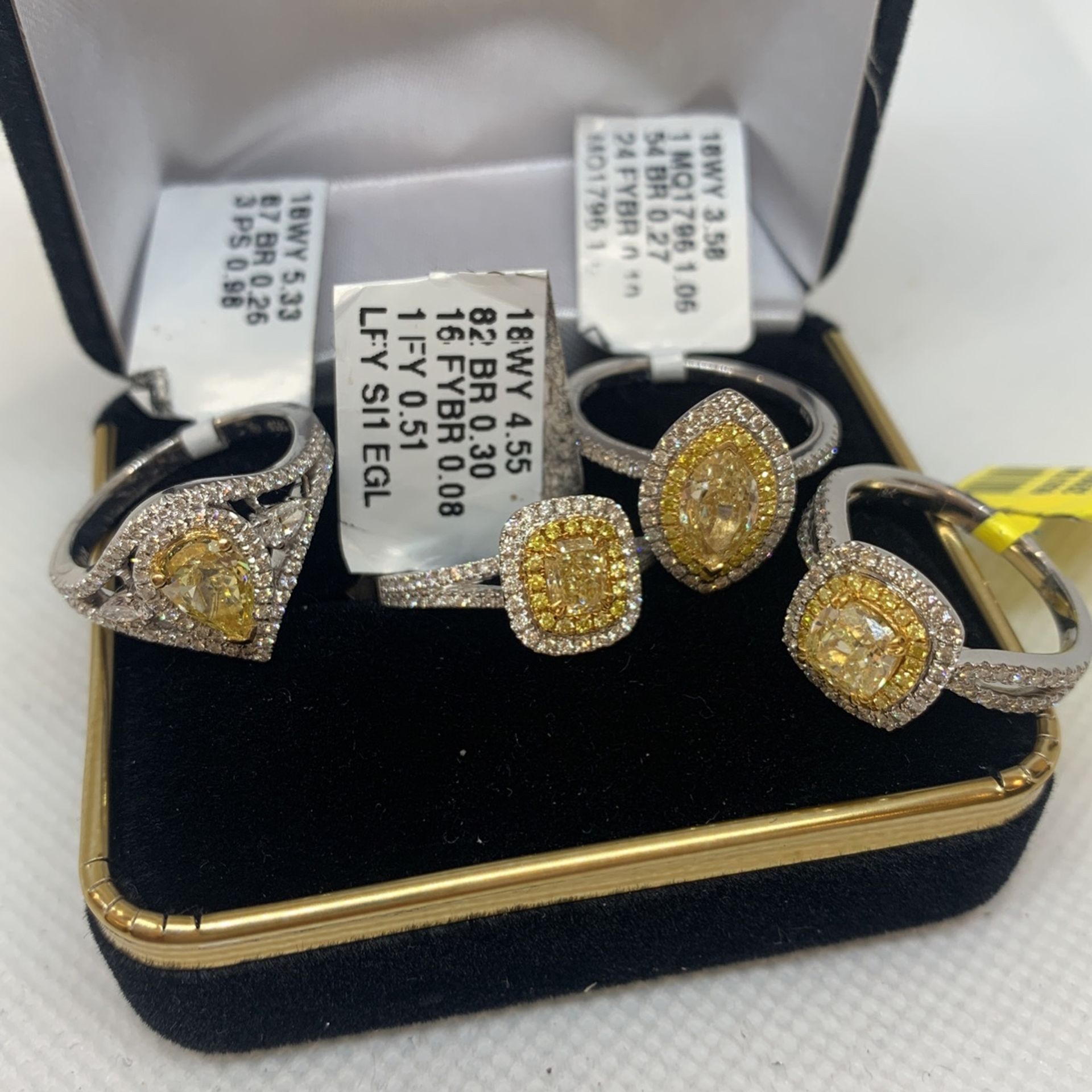 1. 18 K W Gold natural canary diamond 1.85 cts total weight Pear shape $4559. 2. Markee canary diamond 18 k w ring 1.06 ct 0.37 ct side diamonds $5500 3. 18 K W Gold cushion cut natural canary diamond ring 0.89 cts $3200 4. 18 K natural Canary diamond cushion cut 0.83 ct center 0.41 sides 1.24 ct total weight $6500