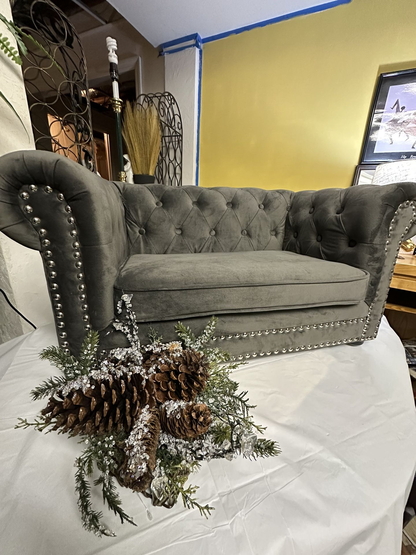 🌟Tailored with velvet upholstery, the Louie pet bed features the rolled arms, button-tufted backrest and nail-head trim of a traditional Chesterfield sofa🌟A sumptuous sleeping spot for lucky dogs and cats in a choice of neutral colors, it's handcrafted to last with a durable hardwood frame with a cozy cushion and washable slipcover🌟 🌟 Handcrafted of a wood frame with velvet upholstery and metal nail trim🌟 Removable seat cushion with removable insert 🌟Suitable for pets up to 110 🌟Upholstery: spot clean only; cushion: remove slipcover, machine wash and line dry; do not wash cushion insert Dimensions: 33"W x 20"D x 16.5"H, 21.4 lbs. **Local Pickup Only - Cashapp or ApplePay