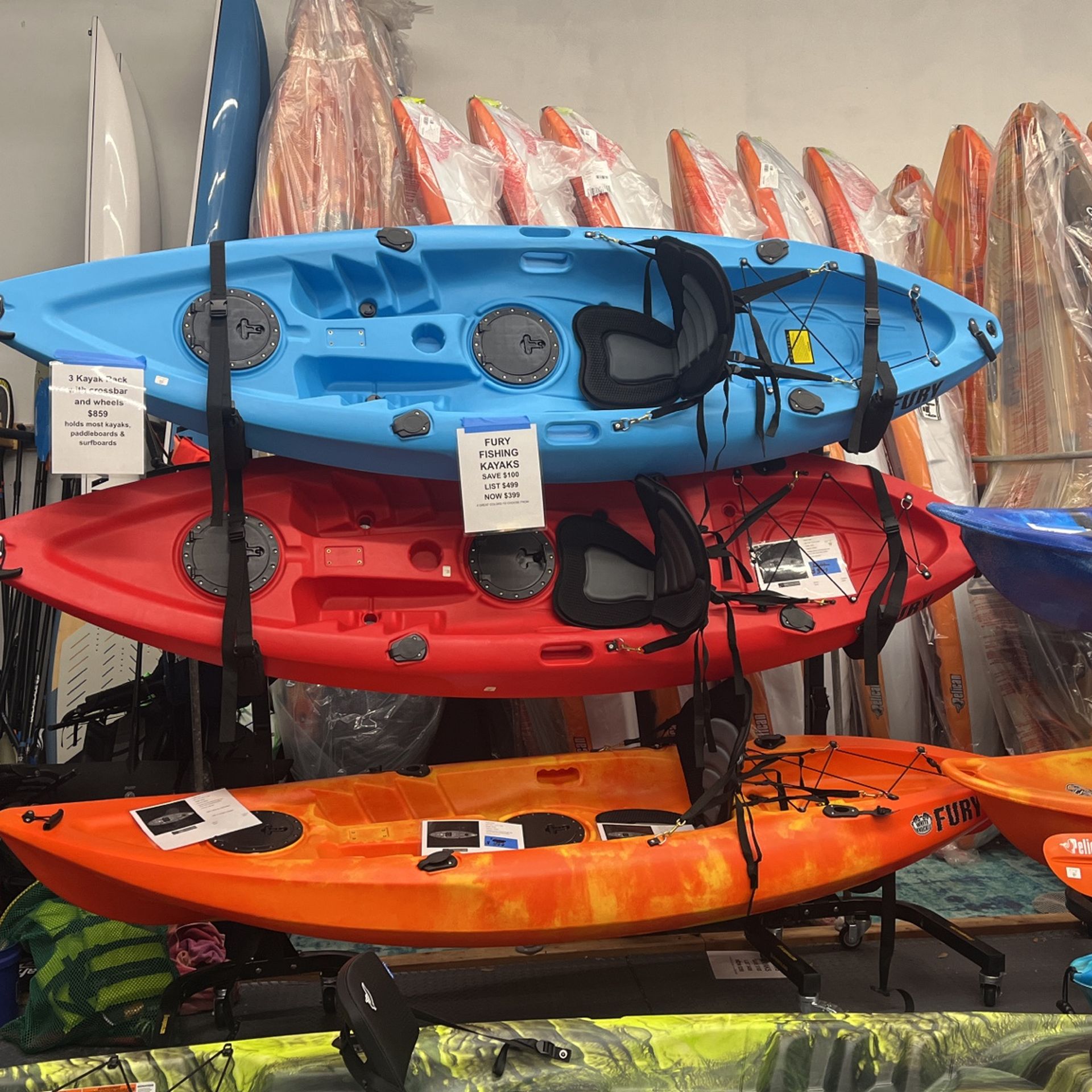 10’ Fury fishing kayak super safe sit on top self bailing hull these new boats come with super comfy high back seat, 4 rod holders, 4 handles and 2 hatches available in 4 great colors to choose list price is $499 each kayak , special deal now is $399 each kayak plus tax available for pick up from our store in largo