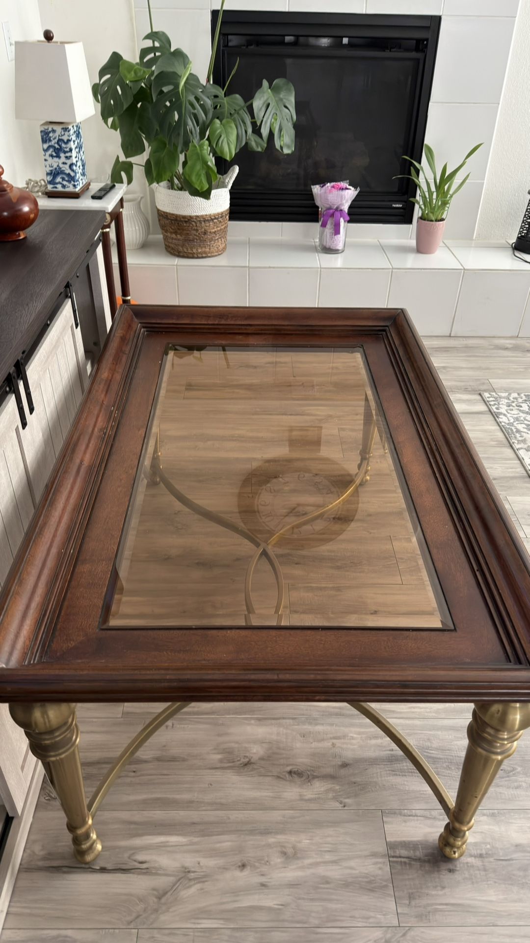 31” width x 49” length x 22” height Used but still in good condition. Real wood with glass top. Pick up in Eastvale