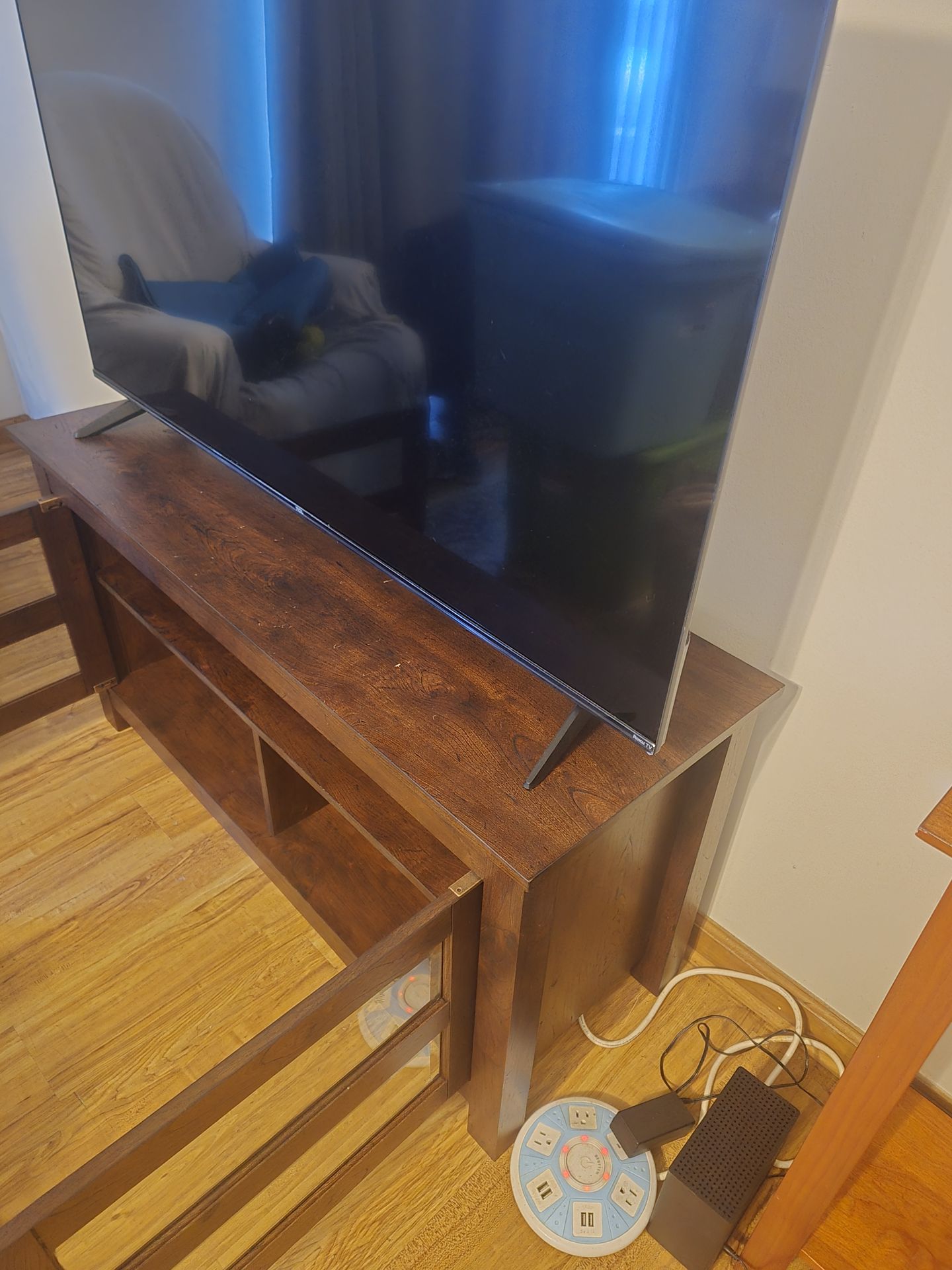 50 inch dark brown TV stand TV is not for sale, shown has a reference for size. No scratches or damage.