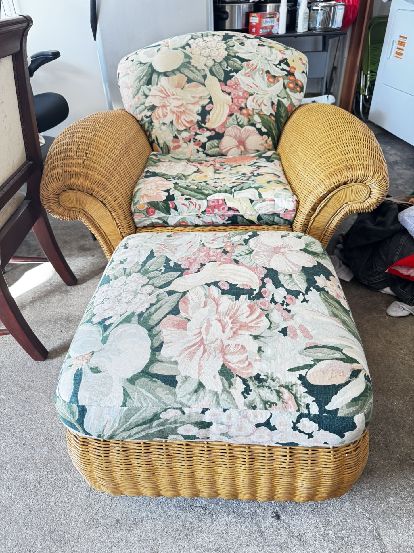 Indoor vintage wicker lounge chair and ottoman with floral cushions in great condo
