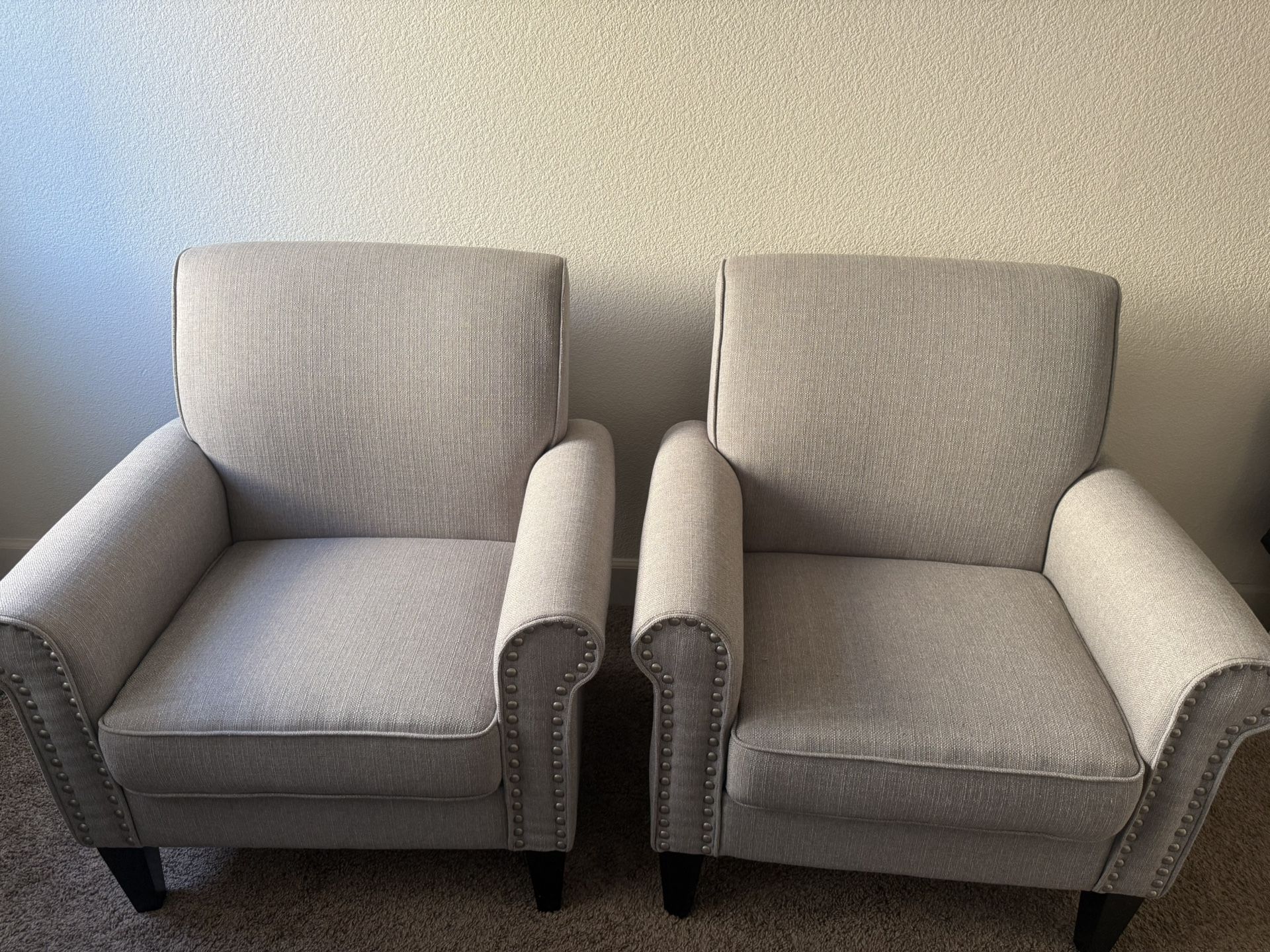 Set of two light grey chairs with dark brown wooden legs. Both are in great condition. Purchased from Wayfair for $300 each, but selling the set for $80.00 OBO. No delivery.