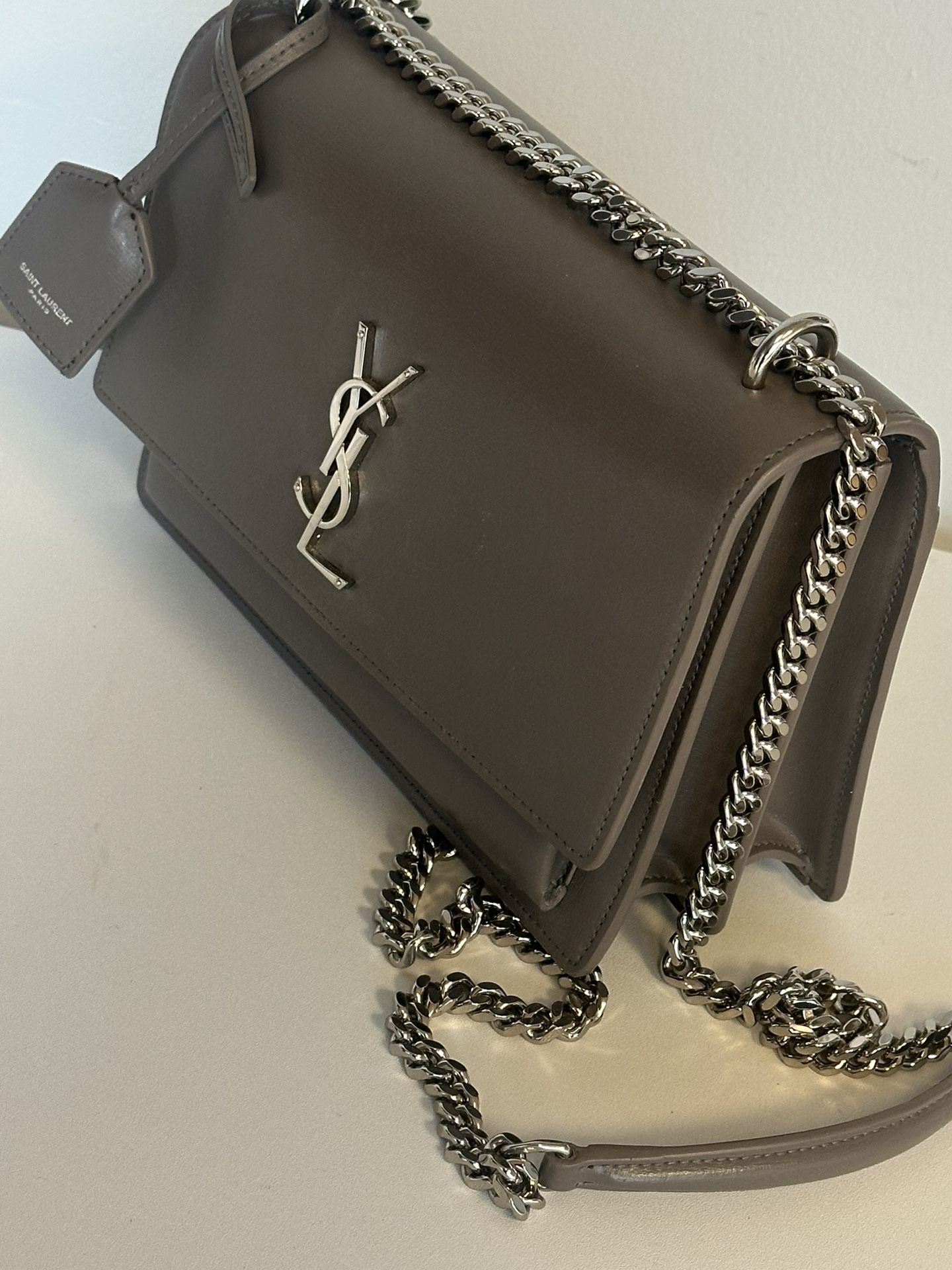 This is an authentic SAINT LAURENT Calfskin Medium Monogram Sunset in Fog. This stunning shoulder bag is crafted of grey calfskin leather. The bag features a silver strap with a shoulder pad, a front flap with a signature YSL logo, gusseted sides, and both an interior and exterior pocket. The flap opens with a snap to a partitioned suede interior with a patch pocket. New/ never used Still have original receipt Calf skin