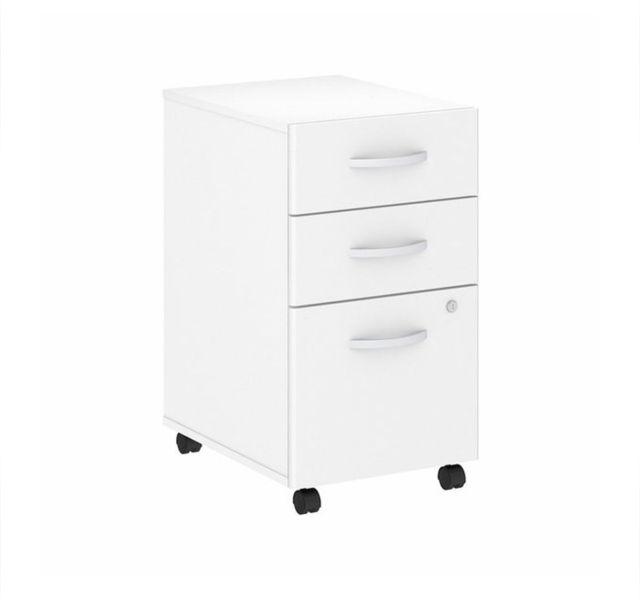 Studio C 3 Drawer Mobile File Cabinet in White Description The Bush Business Furniture Studio C 3 Drawer Mobile File Cabinet rolls with you throughout your office or remains in place as needed on any surface. You'll have your letter, legal and A4-size paperwork organized in no time as the Mobile File Cabinet ships fully assembled for your convenience. Two box drawers hold your pens, notepads, small office supplies and more to organize your workspace. The file drawer opens on full-extension ball-bearing slides, making it easy to reach those pesky papers all the way at the back. Dual-wheeled, hooded casters keep the 3 drawer cabinet moving wherever you want or remain in place on your office floor or carpet. A single lock secures the bottom 2 drawers to keep your paperwork private. When space is at a premium, the Mobile File Cabinet conveniently fits under your desk. Eye-catching Brushed Nickel drawer pulls complement the White or Storm Gray finish to make the cabinet as attractive as it is functional. This contemporary office furniture comes meets ANSI/BIFMA quality test standards. See the full collection for coordinating items available to make your office your own with Studio C.