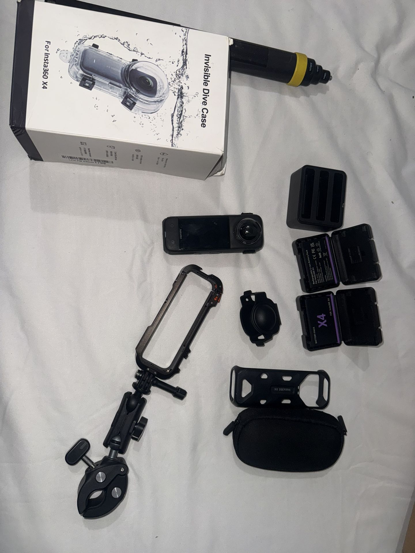 Like new only used a couple of times. Includes: Insta 360 Extended Selfie Stick (9.8ft) 2 After market batteries with charging dox Original Battery Original Case , sleeve, and lens cover Waterproof diving housing Aluminum Cage Camera Clamp