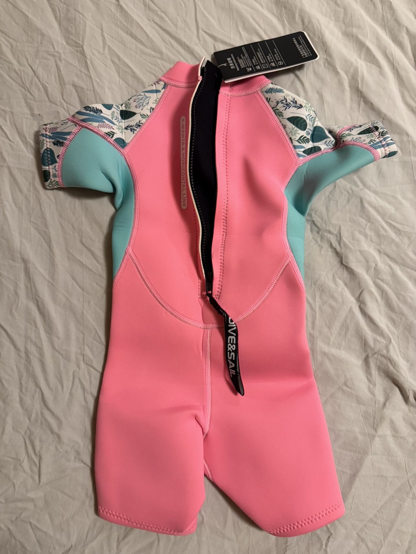 The Dive and Sail X-Manta Pink Wet Suit is a UV rash protector designed for youth aged 2-3. Made in China, this small-sized wet suit is brand new with tags.