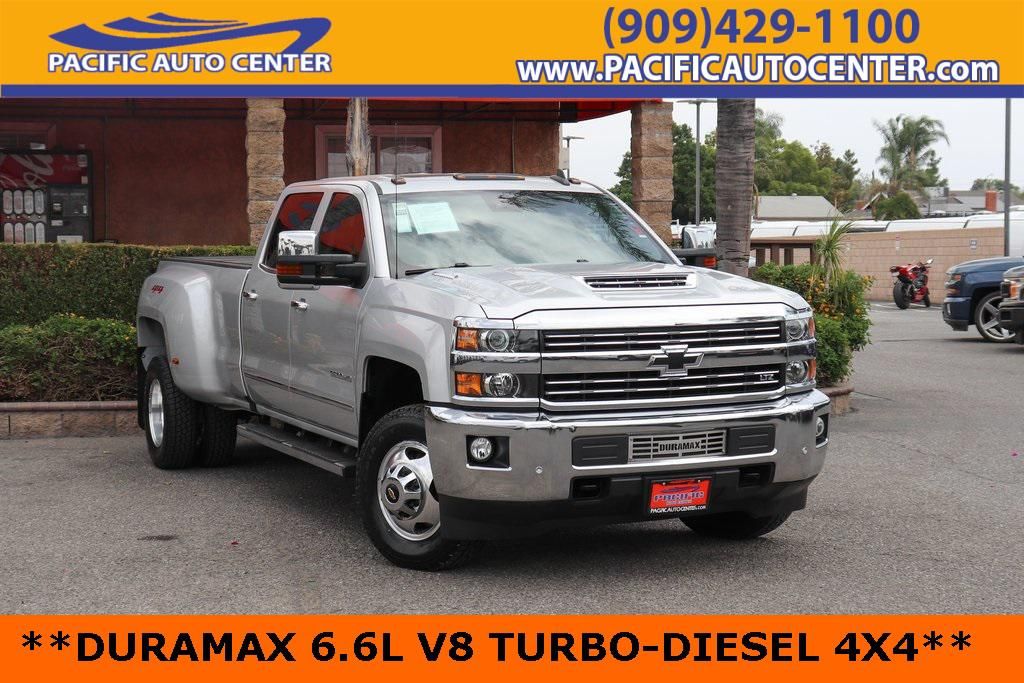 **CLEAN CARFAX**, **DURAMAX 6.6L V8 TURBO-DIESEL 4X4**,**LTZ PLUS PACKAGE**,**DURAMAX PLUS PACKAGE**,**DRIVER ALERT PACKAGE**,**GOOSENECK/5TH WHEEL PACKAGE**,**CREW CAB**, **DUALLY**, **MEMORY SEATS**, **LEATHER SEATS**, **HEATED/VENTILATED SEATS**, **DUAL ZONE A/C**, **NAVIGATION SYSTEM**, **PREMIUM SOUND SYSTEM**, **POWER SUNROOF**, **POWER WINDOWS**, **POWER SEATS**, **POWER DOOR LOCKS**, **BACK-UP CAMERA**, **TOW PACKAGE**, **TRAILER BRAKE CONTROL**, **5TH WHEEL**, 3.73 Rear Axle Ratio, 6-Speaker Audio System, Driver Alert Package, Duramax Plus Package, Engine Block Heater, Forward Collision Alert, Gooseneck/5th Wheel Prep Package, HD Radio, Lane Departure Warning System, Leather Wrapped Heated Steering Wheel, LTZ Plus Package, Power Adjustable Pedals, Radio: Chevrolet MyLink w/Navigation, SiriusXM Satellite Radio. Duramax 6.6L V8 Turbodiesel Allison 1000 6-Speed Automatic**PLEASE DO NOT HESITATE TO CONTACT ANY OF OUR WELL QUALIFIED SALES ASSOCIATES FOR MORE INFORMATION ON THIS VEHICLE**PACIFIC AUTO CENTER HAS THE LARGEST SELECTION OF TRUCKS IN CALIFORNIA**PLEASE VISIT US AT PACIFICAUTOCENTER.COM.All prices plus government fees and taxes, any finance charges, any dealer document processing charges ($85), any electronic filing charge, and any emission testing charge. The Advertised Price for any vehicle does not include dealer-installed accessories. These accessories can be purchased for an additional cost; WHEELS, LIFT KITS, LOWERING KITS, TINT, PRE-INSTALLED ETCH THEFT DETERRENT, 3M DOOR EDGE GUARDS, GPS DEVICE. PLEASE CALL TO SPEAK TO A SALES ASSOCIATE FOR MORE INFORMATION!2018 Chevrolet Silverado 3500HD LTZ 4D Crew Cab