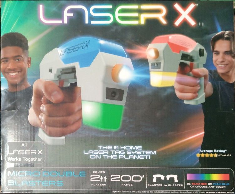 Laser X is the #1 home Laser Tag System on the PLANET! It's like having a laser tag arena right in your own backyard! Blast opponents up to 200 feet away - inside or out, in darkness or bright sunlight. Choose from more than 10 team colors to light up your blaster! Blaster beams go through windows and strategically bounce off walls and mirrors to hit opponents. The Micro Blasters compact size is easy to take anywhere! All Laser X gear works together. Games can include unlimited players. Set equips 2 players with Laser X Revolution Micro Blasters Blaster to blaster play no chest or armband receivers! Play as teams or individuals Sounds and lighting effects keep track of your shots and hits Works inside or out / day or night All Laser X gear works together Requires 6 AAA (1.5V) batteries (not included) Does NOT use a real laser Infrared beam is not visible Ages 6+ Does not use Laser. Infrared beam is NOT visible. © and ¿ 2024 NSI International, Inc., and NSI Products (HK) Limited. All Rights Reserved.