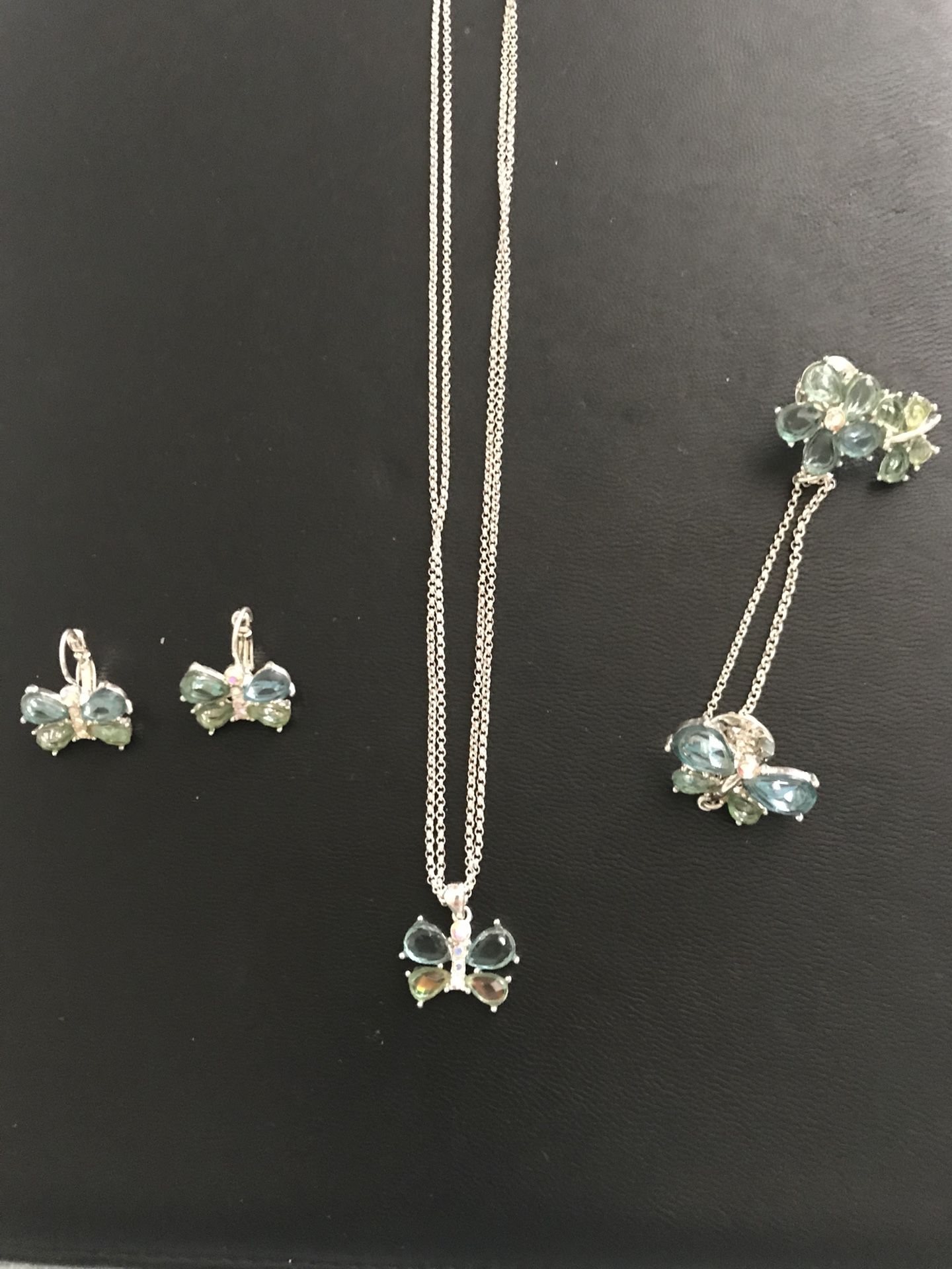 Cute jeweled butterfly jewelry set: earrings, necklace, pin.