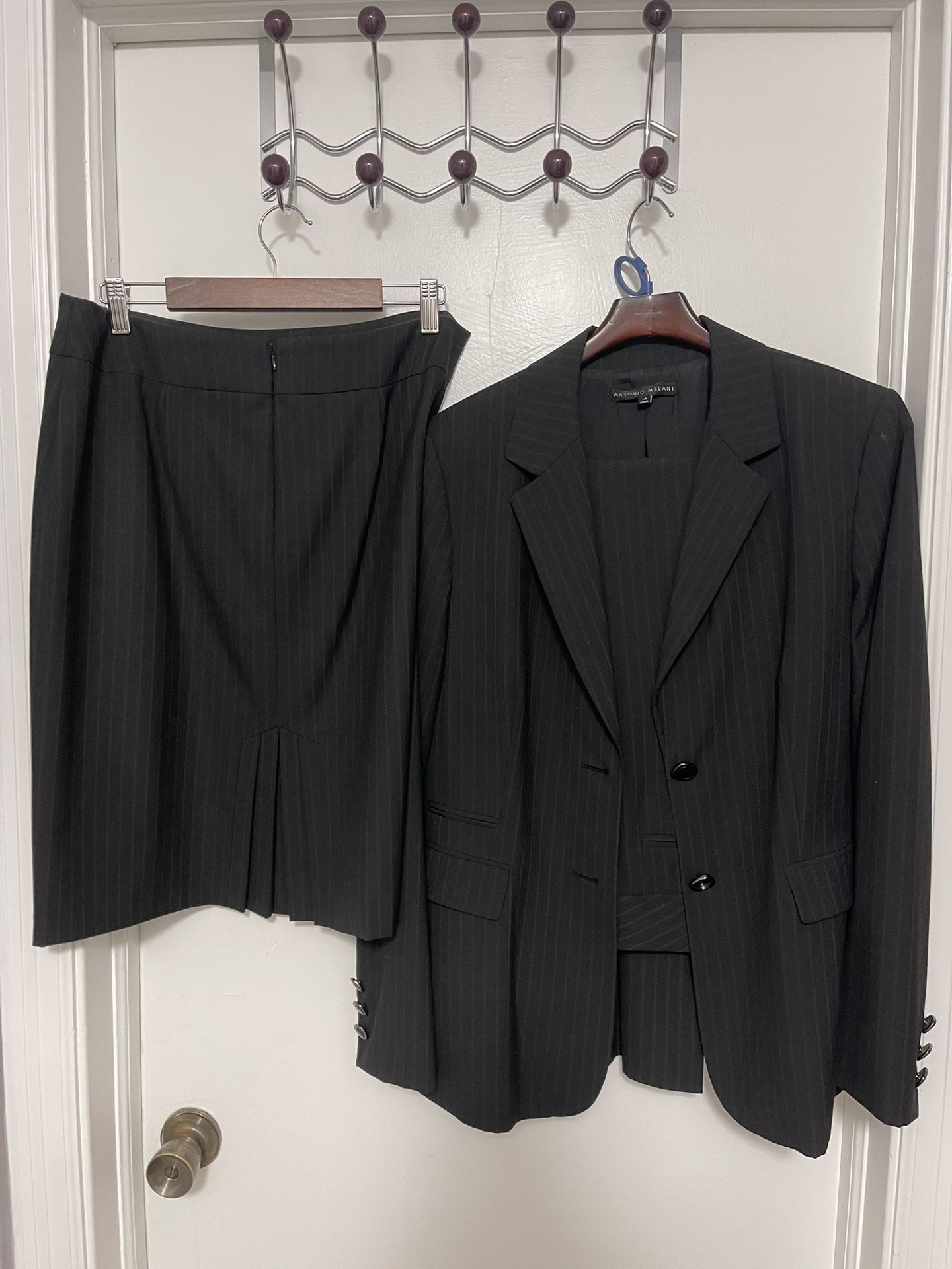 Antonio Melani, Size 14, pinstripe jacket, pants, and skirt, preowned, like new, only wore twice for interviews. Purchased at Dillards. All pieces fully lined. Jacket and pants have usable pockets. Skirt is nicely pleated in the back. Beautiful suit!