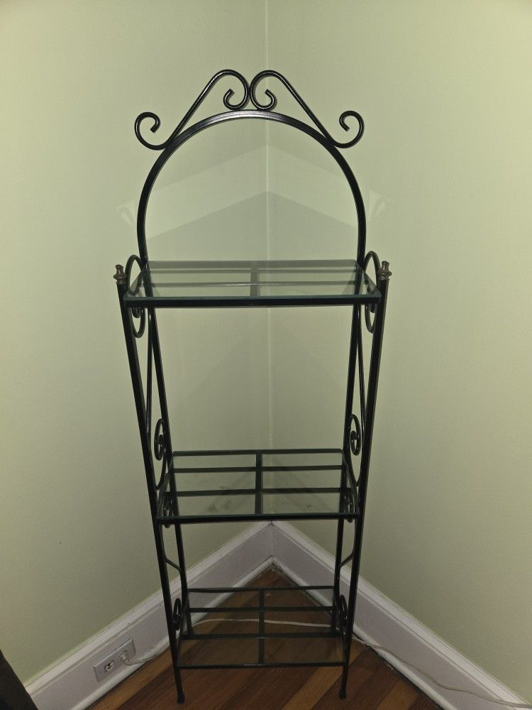 Black metal and glass 3-tier shelf. Has three glass shelves and a decorative top. 60"H, 18"L, 9"W