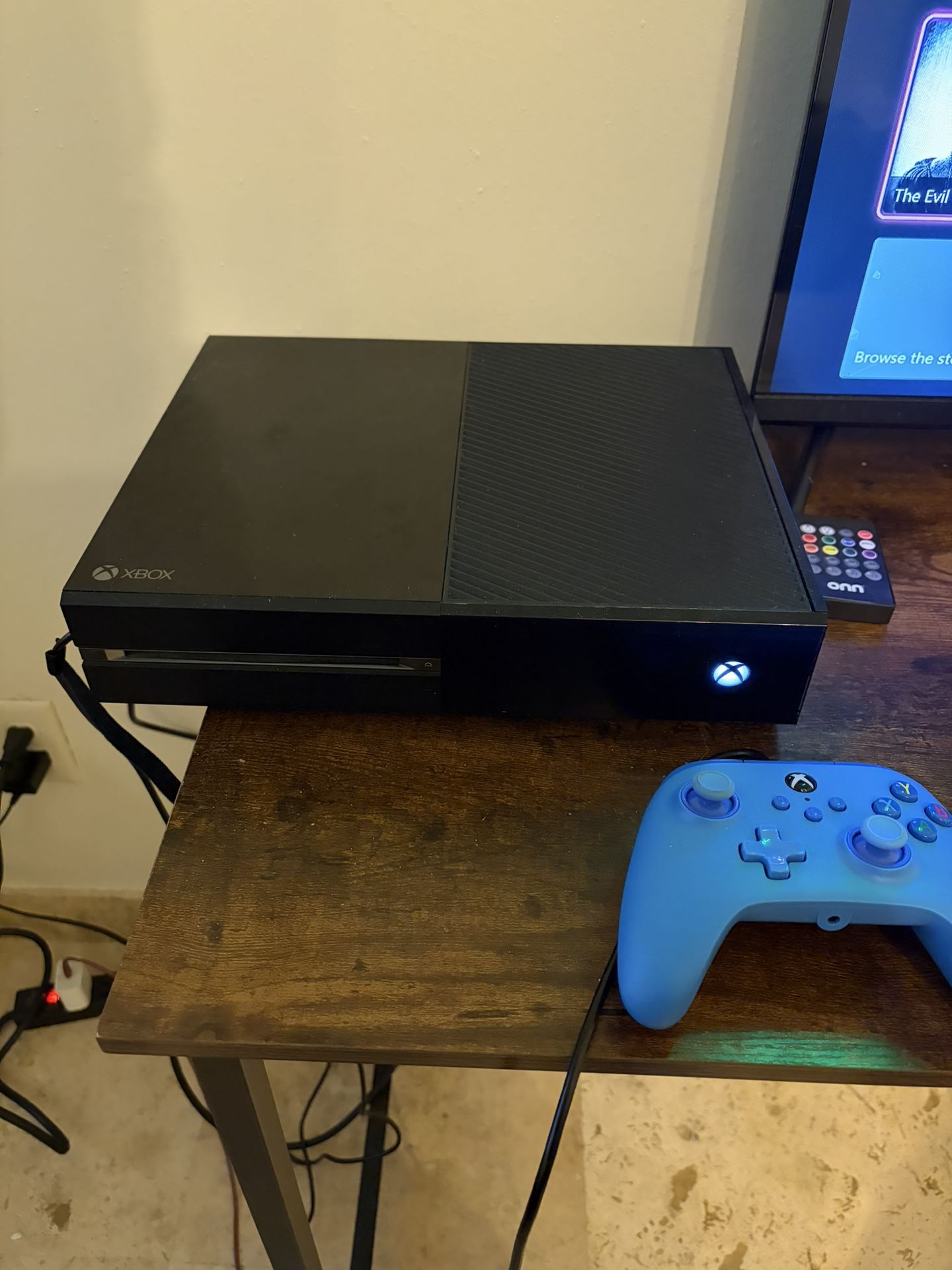 Og 500 gb Xbox one, fully working. Clean and tested. Will factory reset before pickup. Comes with one blue wired aftermarket controller.