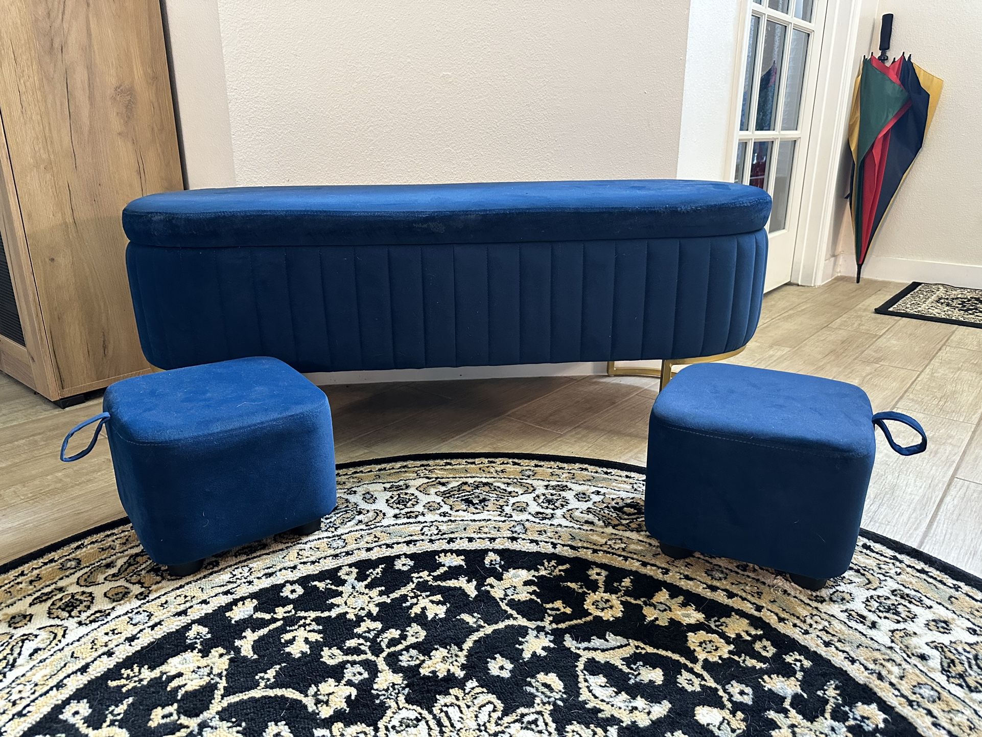 Beautiful art deco bench in blue velvet with storage and two footstools