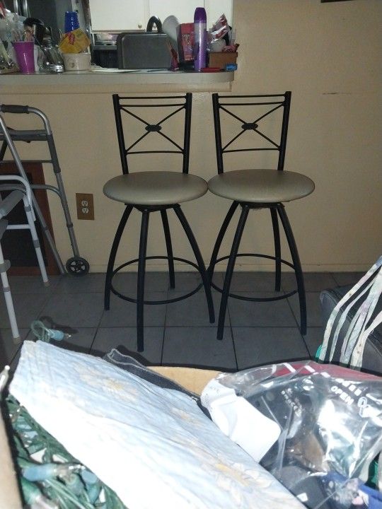 This pair of Swivel Bar Stools. Cast iron frame work. From floor to top of chair back is 37 1/2 From floor to seat is 24 .Seats round off white leather. Good condition