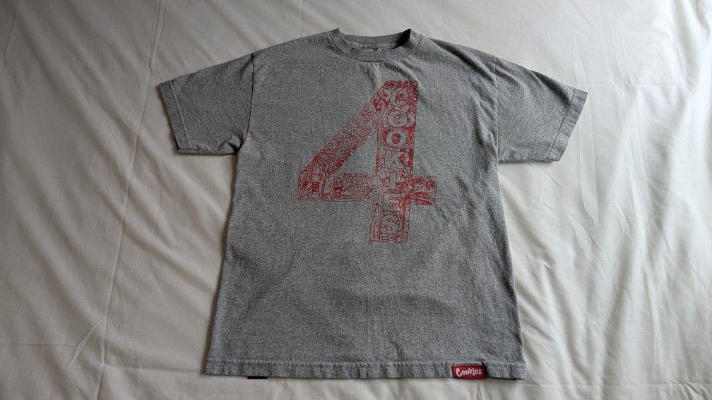 Cookies brand t shirt has light stain as seen in photos bout the size of a dime , still in good condition Light gray with red color printed design, size medium