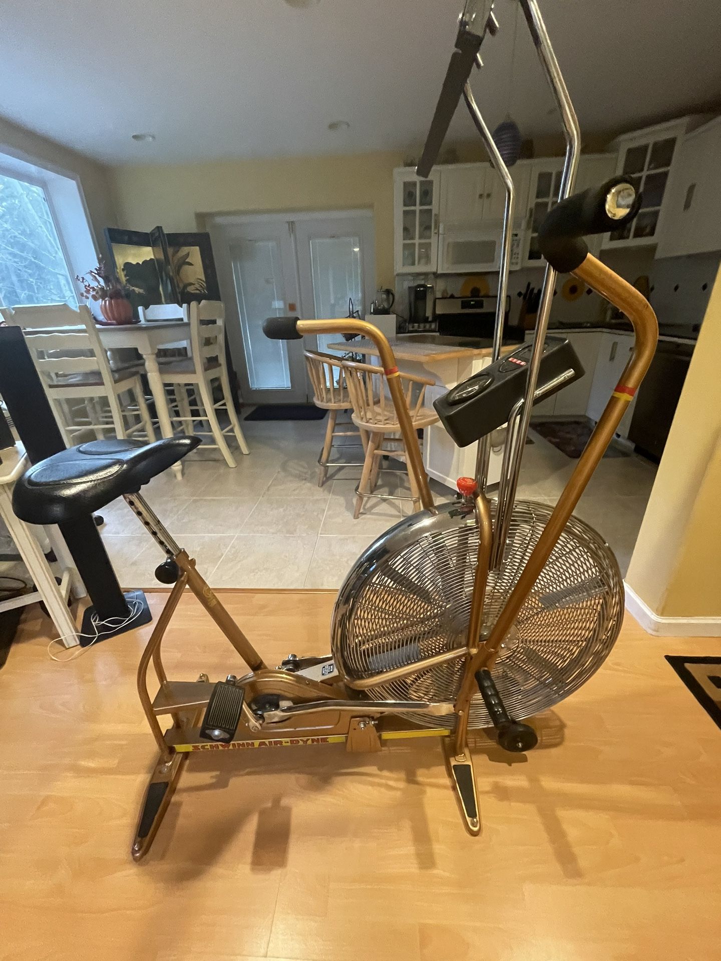 Start the New Year with a well built schwinn arrodynne bike that has a wide seat, book stand for reading while you workout. Also cools you while you sweat. Works the arms and legs for a total body workout . Needs a cable to operate mph… otherwise perfect condition.