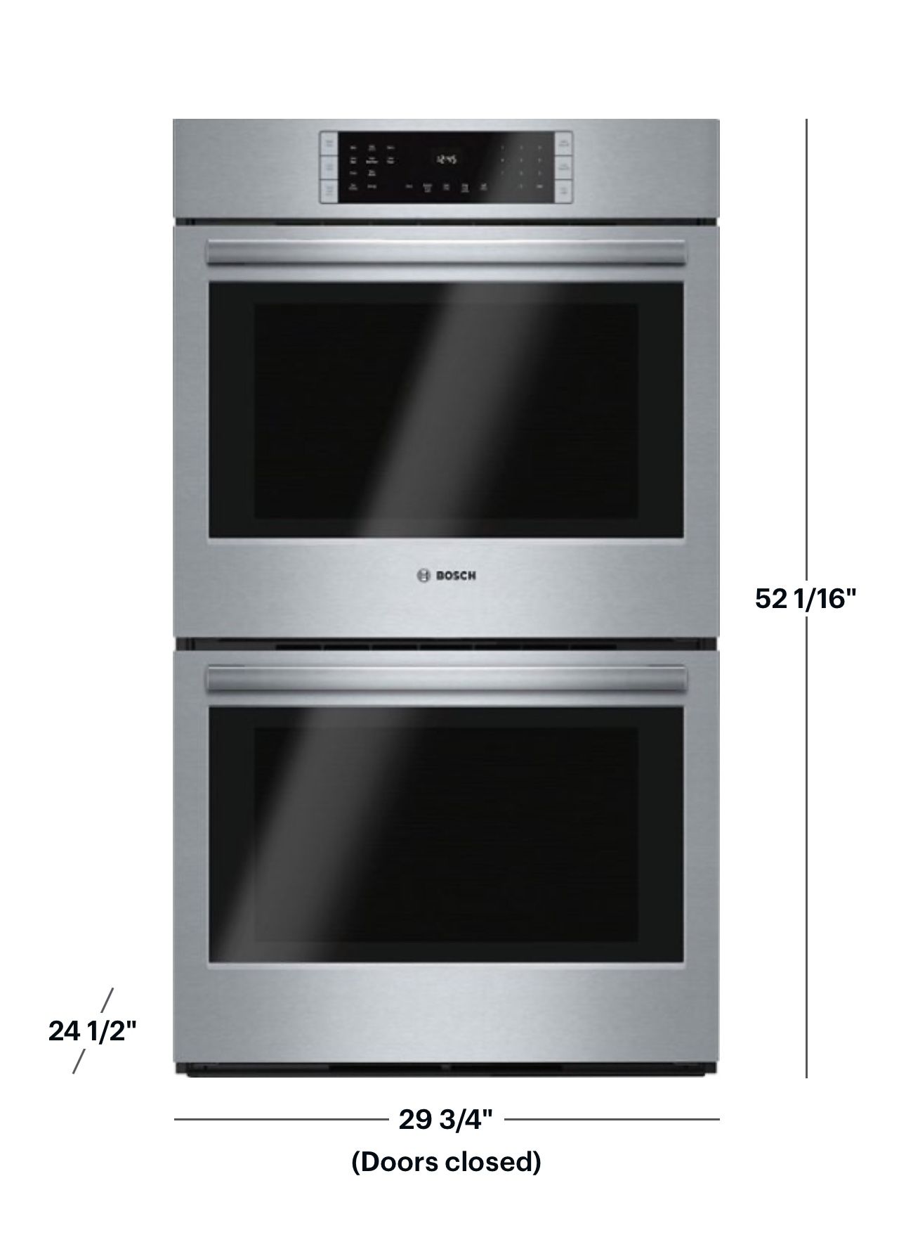 Bosch - 800 Series 30" Built-In Electric Convection Double Wall Oven - Stainless Steel Key Specs: Product Height 52 1/16 inches Product Width 29 3/4 inches Product Depth 24 1/2 inches Depth Without Handle 24 1/2 inches Depth With Handle 26 5/8 inches Oven 1 Convection No Oven 2 Convection Yes App Compatible No Color Finish Stainless steel General Product Name 800 Series 30" Built-In Electric Convection Double Wall Oven Brand Bosch Model Number HBL8651UC Vendor Collection Bosch 800 Series Color Stainless Steel Color Finish Stainless steel Dimension Product Height 52 1/16 inches Product Width 29 3/4 inches Product Depth 24 1/2 inches Standardized Width 30 inches Depth Without Handle 24 1/2 inches Depth With Handle 26 5/8 inches Depth With Door 90 Degrees Open 45 7/8 inches Product Weight 261 pounds Cut-Out Dimensions Cut-Out Height 49 3/4 inches Cut-Out Width 28 1/2 inches Cut-Out Depth 23 1/2 inches Capacity Oven 1 Capacity 4.6 cubic feet Oven 2 Capacity 4.6 cubic feet Features Oven Type Double wall oven Oven Power Source Electric Auto Shut-Off No Control Type Touchpad, Button Clock Display Yes Lock Type Control panel lock, Self-cleaning mode lock Oven Light Yes Wireless Connectivity None Removable Turntable No Design Display Type LCD Function Sabbath Mode Yes Delay Clean Option No Hidden Bake Element No Keep Warm Setting Yes Variable Broil Yes Timer Yes Time Bake Yes Rapid Preheat No Dehydration Settings No Oven 1 Specification Oven 1 Location Upper Oven 1 Interior Height 12 5/16 inches Oven 1 Interior Width 23 1/4 inches Oven 1 Interior Depth 15 1/4 inches Oven 1 Convection No Oven 1 Convection Type True Convection Oven 1 Window Yes Oven 1 Cleaning Method Self-High Heat Cleaning Number of Oven 1 Rack Positions 7 Number of Oven 1 Racks 2 Oven 1 Bake Element 2400 watts Oven 1 Broil Element 3800 watts Oven 2 Specification Oven 2 Location Lower Oven 2 Interior Height 12 5/16 inches Oven 2 Interior Width 23 1/4 inches Oven 2 Interior Depth 15 1/4 inches Oven 2 Convection Yes Oven 2 Window Yes Oven 2 Cleaning Method Self-High Heat Cleaning Number of Oven 2 Rack Positions 7 Number of Oven 2 Racks 3 Oven 2 Bake Element 2400 watts Oven 2 Broil Element 3800 watts Electrical Specification Amperage 40 amperes Voltage 240 volts Wattage 8495 watts Amperage At 208 Volts Yes Amperage At 240 Volts Yes Kilowatt Rating At 208 Volts Yes Kilowatt Rating At 240 Volts Yes Included Power Cord Included Yes Certifications Listings & Approvals ADA Compliant No Product Safety Certifications and Standards CSA Listed Chemical Disclosures Free of PFAS, PFOA, lead, and cadmium. Libre de PFAS, PFOA, plomo, y cadmio. Warranty Manufacturer's Warranty - Parts 1 year limited Manufacturer's Warranty - Labor 1 year limited Compatibility App Compatible No Other UPC (contact info removed)33 *Delivery available