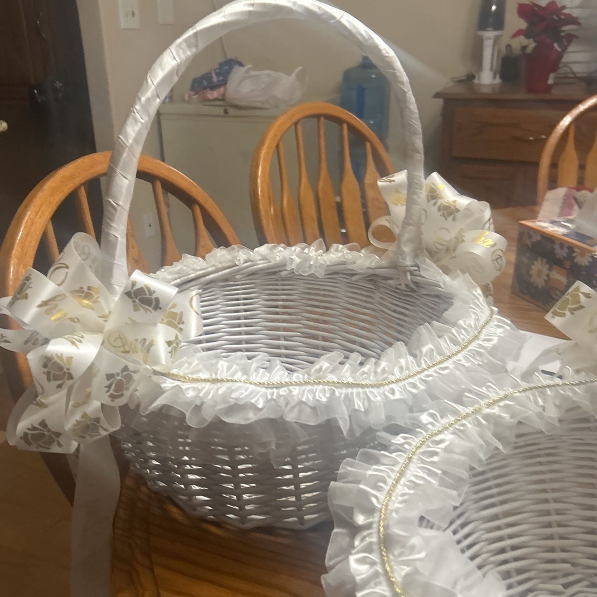 I have four all white /gold baskets different size. $25.00 each or $75.00 for all four