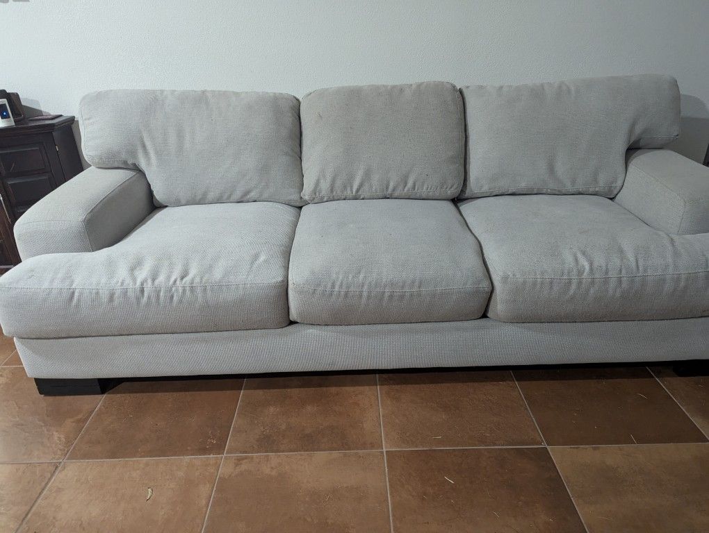 Couch is in good condition, covers can be washed to freshen up. Solid construction, incredibly comfortable bouncy and still new feeling cushions.