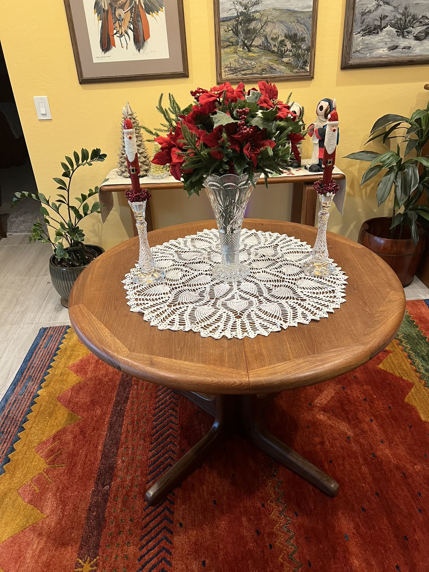 Solid teak table and chairs Table is 41”round and 281/2”high With leaf 41”x61” x 281/2” Located in Queen Creek Near Ocotillo and Meridian