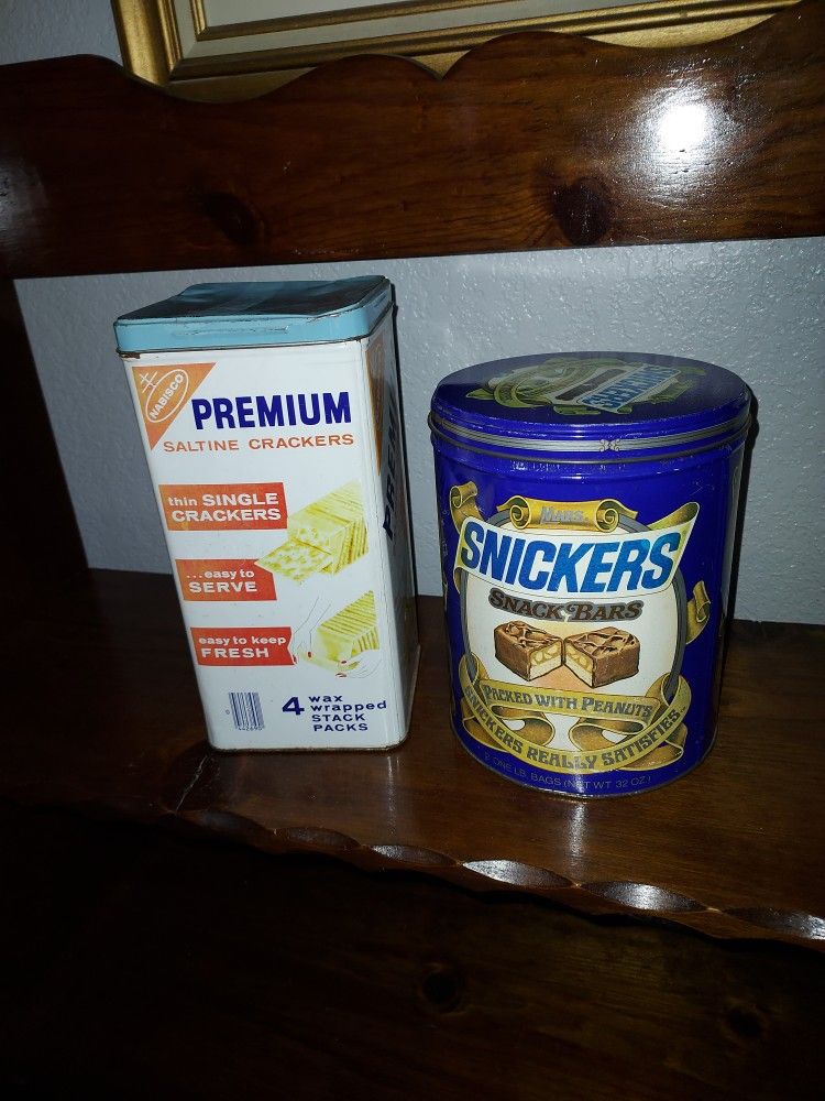 1969 nabisco saltine tin has slight damage, dents on lid. 9.5 in. Tall x 4.5 in. Square 1985 snickers tin very little wear. Approx 7.5 in. Tall x 6 i . Round price is for both.