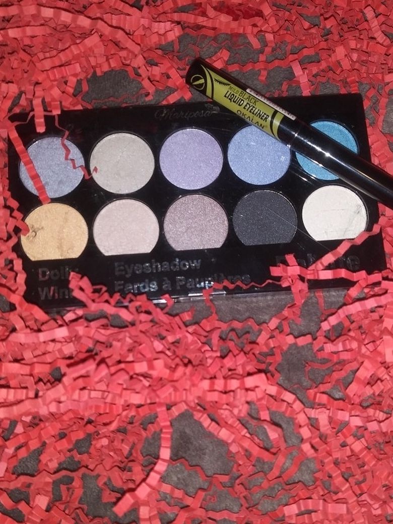 Different Makeup color eyeshadow palettes with a black liquid eyeliner, they go together. All of them cost the same, $9