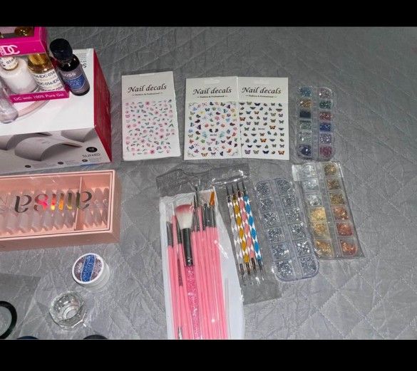 Put this under description Everything for $55 OBO Some nails are missing but there are #330 brand new nails in box. Includes: DND white and lavender polish. Beetles gel base and top coat Aiusa Nails #330 nails in box. Nail brushes/ Nail art/ rhinestones/ foil Kiss Clear Acrylic Powder & liquid Clear Nail stamper SunUV nail lamp. CASH ONLY