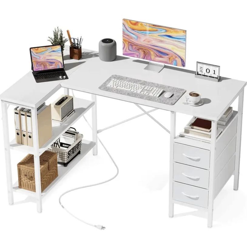 47" L Shaped Computer Gaming Desk with 3 Drawers, Power Outlets, USB Ports, Monitor Stand