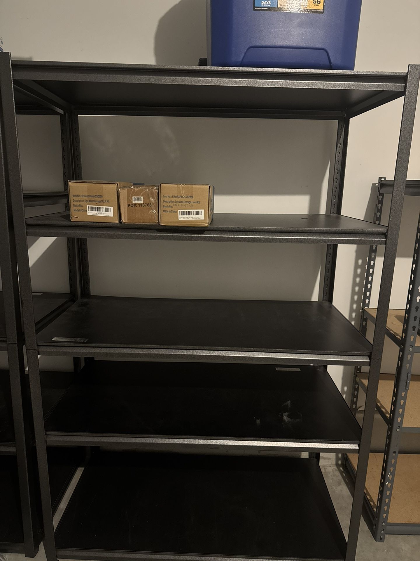 Black metal and wood. Whalen brand. 5 adjustable shelves. 72 tall, 48 wide, 24 deep.