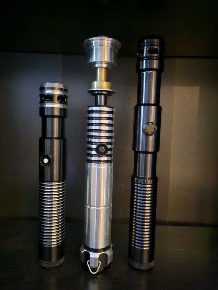 Two basic stunt sabers *no sound. One with a red blade and one with a purple blade. One sound saber with malfunctioning light. I haven't been able to figure out the problem. The sound board works but the light does not come on. All are in good condition and come with blades for each with some light scratches from use.
