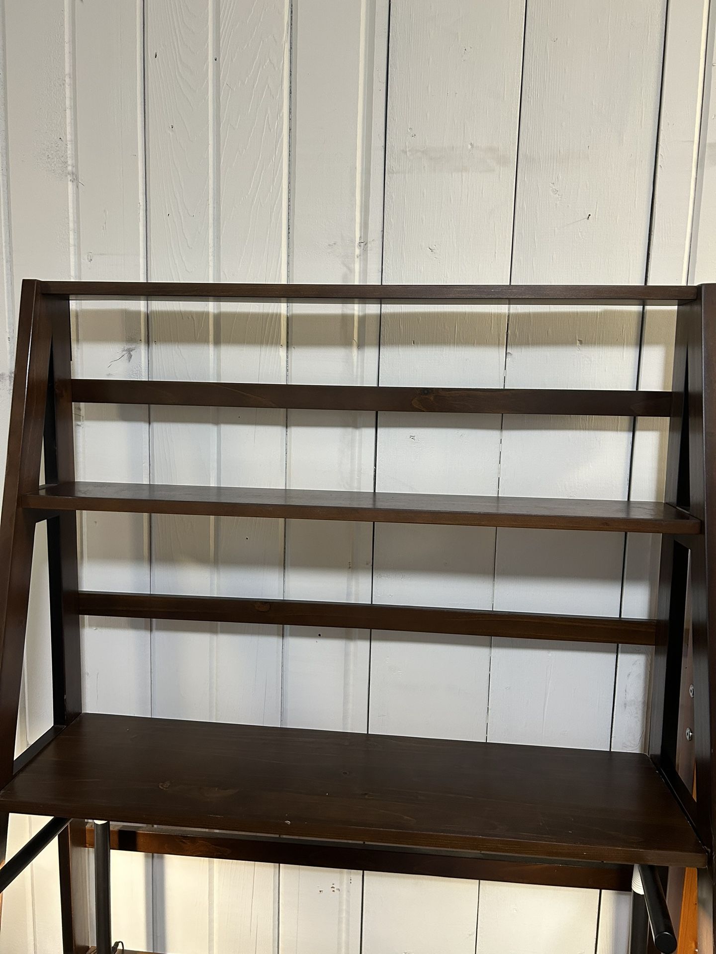 Dark brown ladder table. 5 shelves. 71” tall, 19” deep for biggest shelf, 36” long