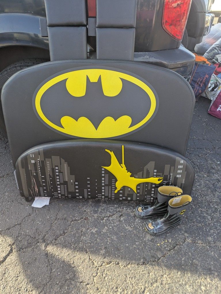 Great Christmas present for your Batman fan. It's a twin headboard and footboard with all the hardware to set it up. Just needs the mattress. This is really nice setup. It looks like black leather once it's set up. Comes with free set of Batman boots!