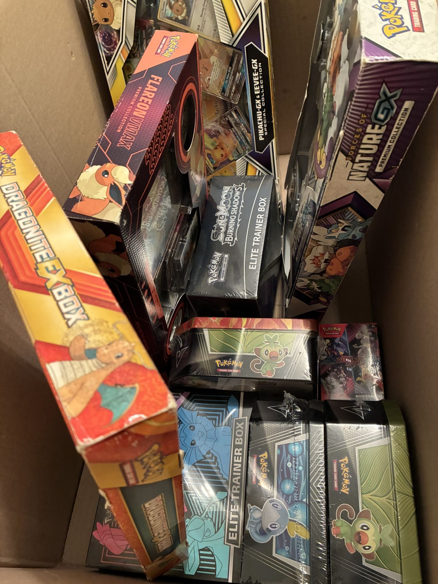 Evolving skies etb $365, Burning shadows etb $275, Dragonite ex box 2016 $225, Forces of nature gx box $275, Flareon vmax box $265, Eevee pikachu gx box $495, Destined rivals booster bundle $45, Galar partners tin $135, Evolving skies pack $35 or $45 if sleeved, Surging sparks pack $7, Scarlet violet pack $6, Brillant stars pack $11, Crown zenith pack $15, Obsidian flames pack $9, Paradox rift pack $6, Chilling reign pack $11.