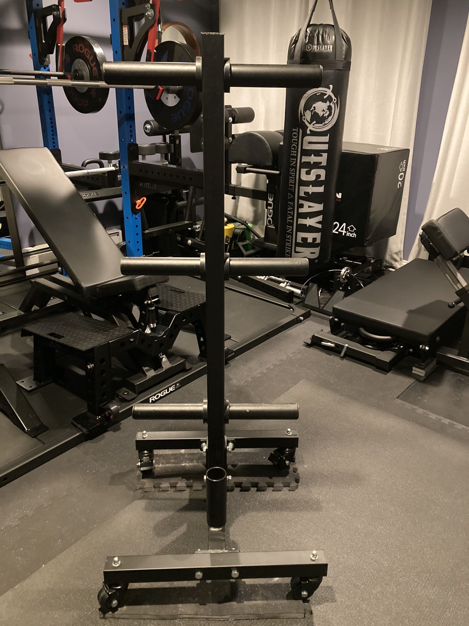 Heavy duty and overbuilt like all Titan Fitness equipment. This will hold whatever you can throw at it. Perfect for your bumper or Olympic weight plates storage needs. Also has two barbell holders and lockable caster wheels for easy portability. Super convenient. Organize your home gym today. Only owned a couple months. This weight tree is in excellent condition. I just paid $250 for this tree a couple of months ago. Assembled and ready to be put to use. Weights, squat rack, adjustable bench, Dumbell, dumbbell, dumbbells, vertical plate tree, organization, plate storage