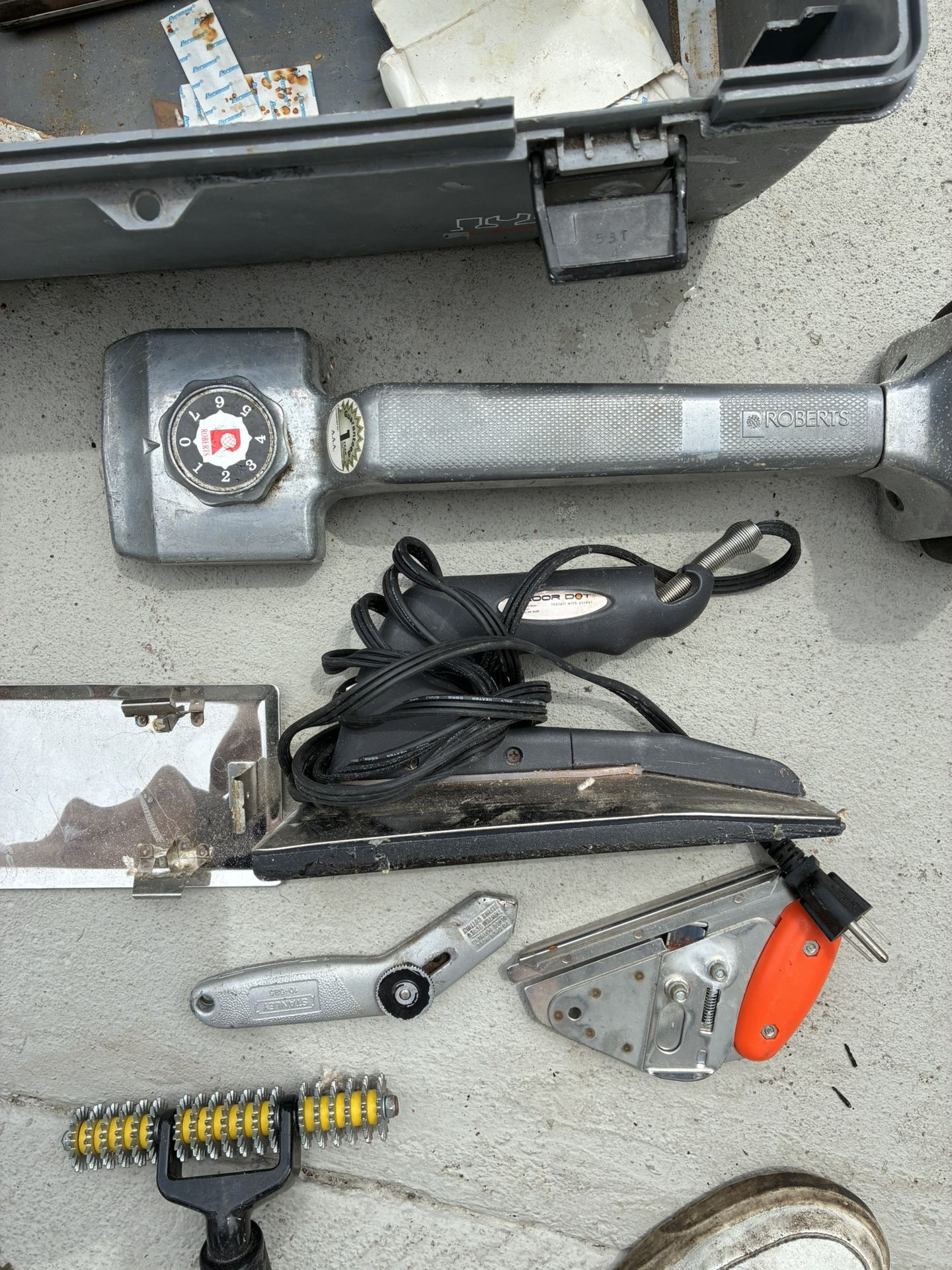 Includes box steamer, kicker, and assorted tools for carpet installation