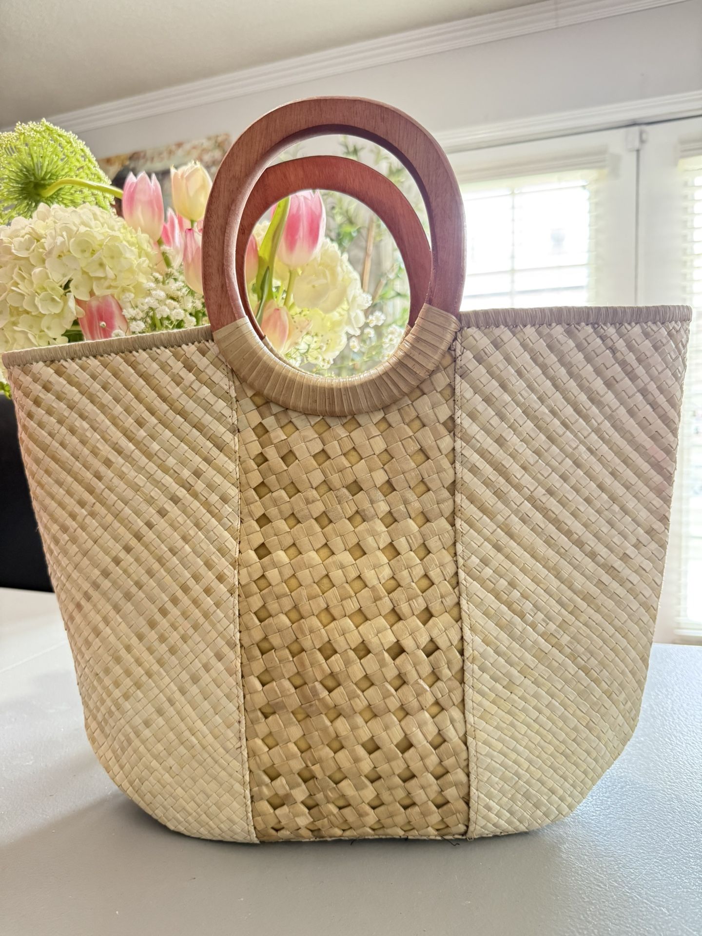 Simple. Elegant. Timeless. This handcrafted tote bag is made from natural palm leaves, woven in a mix of tight and open basket patterns for texture and strength. The neutral tones make it a versatile piece that pairs effortlessly with any outfit. Finished with smooth circular wooden handles wrapped in raffia for comfort and earthy style, it’s perfect for daily errands, beach outings, or eco-conscious gifting. Features: • Made from sustainable palm leaf fibers • Classic woven design with center detail • Natural wooden ring handles • Lightweight and breathable • Approx. dimensions: 14” H x 16” W x 6” D ***AVAILABLE IN PINK AND GREEN color *** Perfect for: Minimalist lovers, boho chic wardrobes, eco-conscious gifting, or summer adventures.