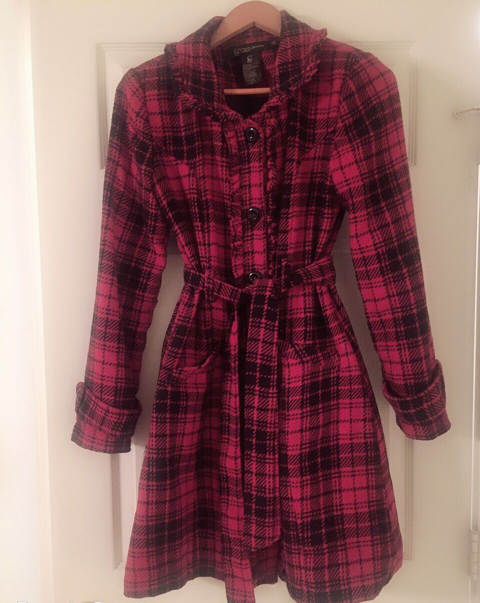 Gently used medium front button down belted trench coat. Polyester and wool. No pockets! Fashion forward. Smoke free pet free home!