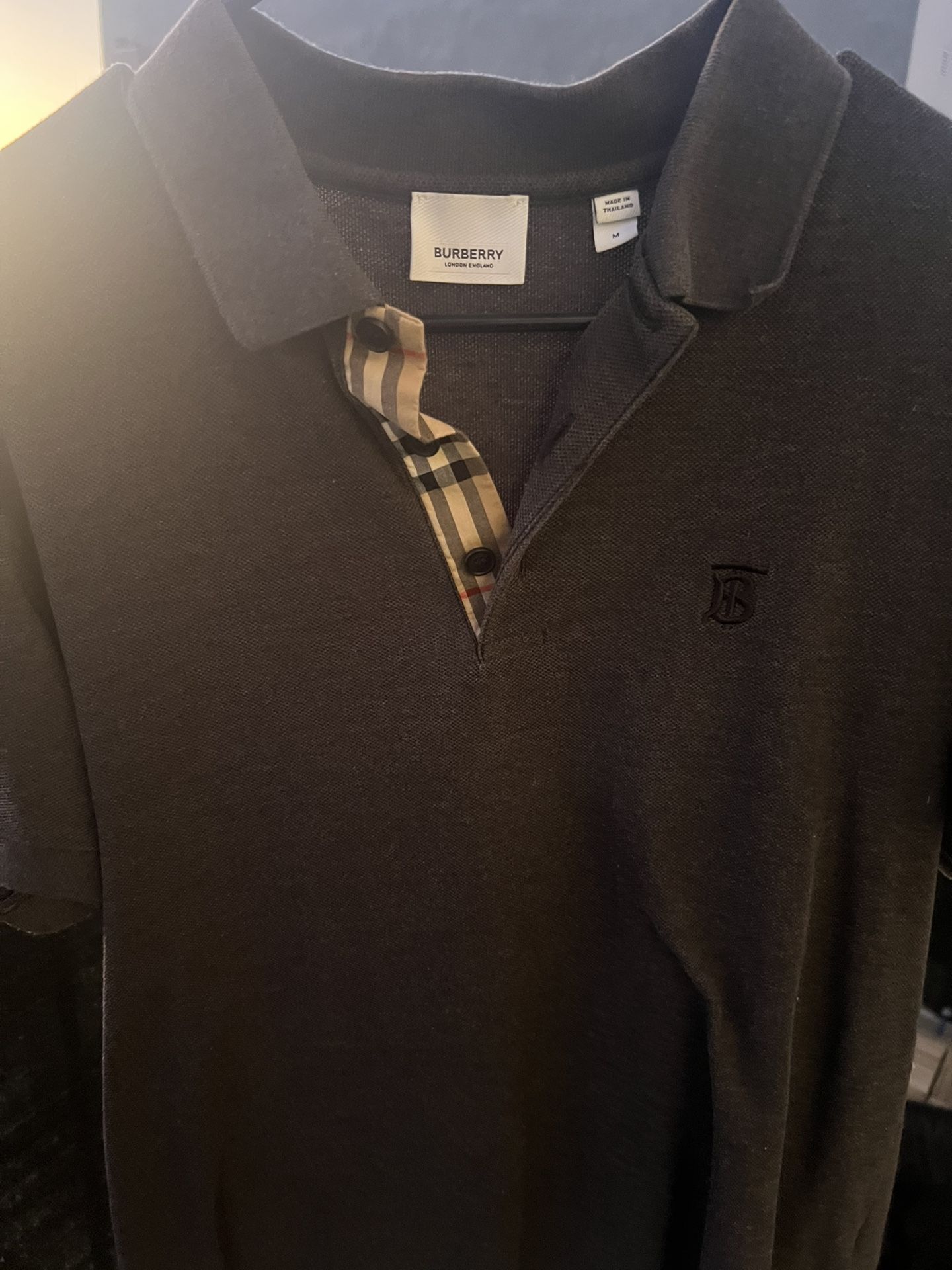 Authentic Burberry London England polo shirt in black, size Medium. Features the signature Burberry check pattern inside the placket and embroidered TB logo on the chest. • Size: Medium • Color: Black • Burberry London England label • Signature check detail inside collar • Comfortable cotton polo style • Great condition Clean, classic designer polo that goes with anything.