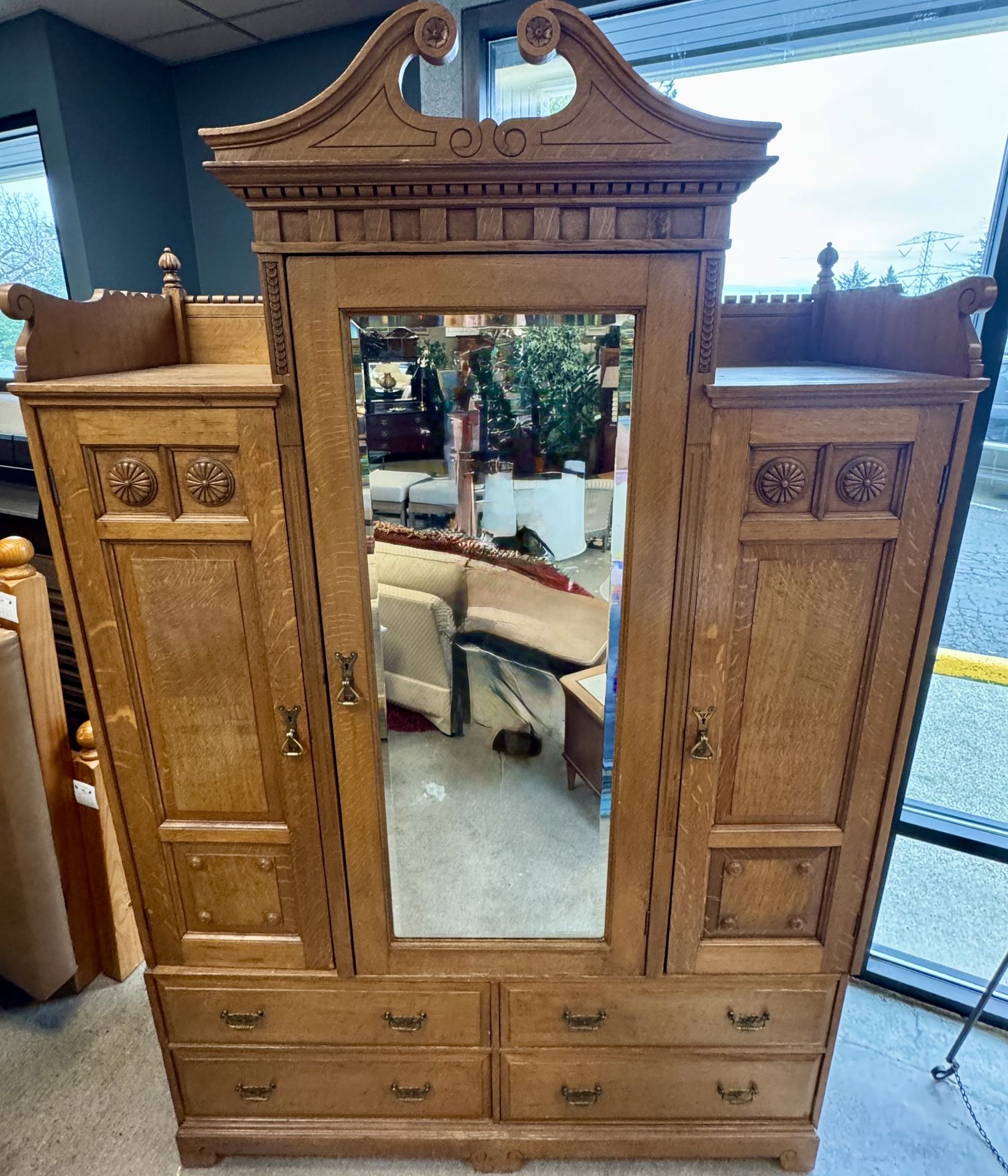 Beautiful antique oak wardrobe with carved detailing, central mirror, and original brass hardware. Features two tall side cabinets, interior shelving, and lower storage drawers. Solid construction with classic turn-of-the-century craftsmanship. Peace comes apart into four pieces: the top three column like structures and the lower dresser part. Overall, the peace is 92 inches high in the middle and 60 inches wide. Shows age-appropriate wear and patina consistent with vintage furniture (see photos), but overall very sturdy and functional. Great as a bedroom armoire, entry storage, or statement piece. ⸻ Available in store at 1108 S 322nd Pl in Federal Way. The FUSION Decor Boutique is a volunteer run, secondhand furniture store. All merchandise is donated, all staff are volunteers, and all proceeds are used to house families experiencing homelessness. Open Tuesday-Saturday from 10am-5pm. For the quickest response, call (contact info removed) to speak to one of our wonderful volunteers. Inventory moves quicky, and we get new donations daily, so check back often to find beautiful new items for up to 75% off retail pricing! Thank you for supporting FUSION!