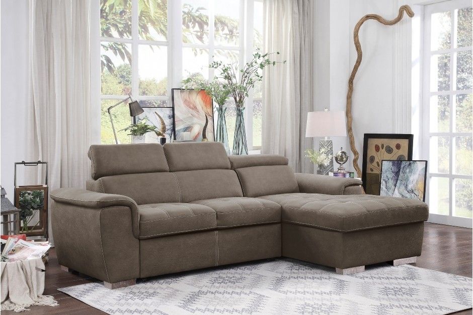 Brand New Taupe Microfiber 2-Piece Sectional with Adjustable Headrests, Pull-out Bed and Right Chaise with Hidden Storage (98 x 65.5 x 39H)