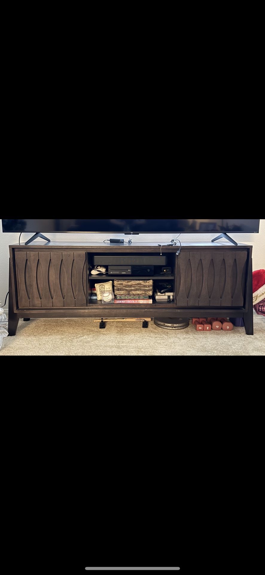 TV Stand. Bought from living spaces. Storage with 2 doors. A few minor chips/scratches shown. Dimensions: 26.5H X 66W X 15.75D. Price negotiable