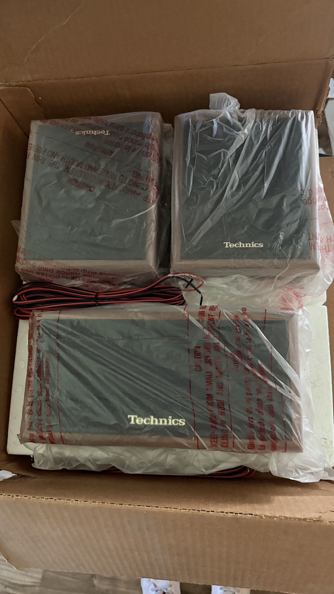 Technics speaker system consists of a center speaker and two surround sound speakers. They come in wood grain colored boxes. Model #SN-AD260. The speakers measure 7.5” tall x 6” wide x 4” deep. The center speaker measures 5.25” tall x 10.75” wide x 4” deep.