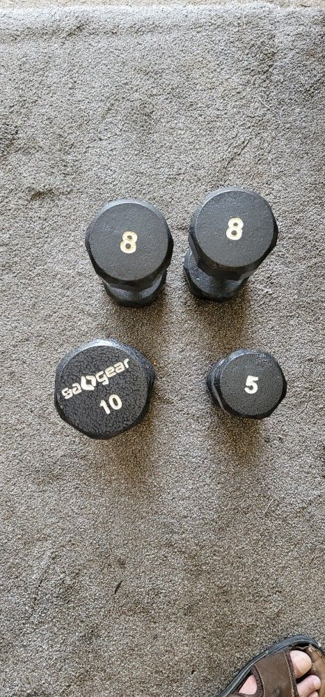 A set of 4 dumbbells - never used. 2 x 8 lbs 1 x 5 lbs 1 x 10 lbs Price is for the set, else $10 each