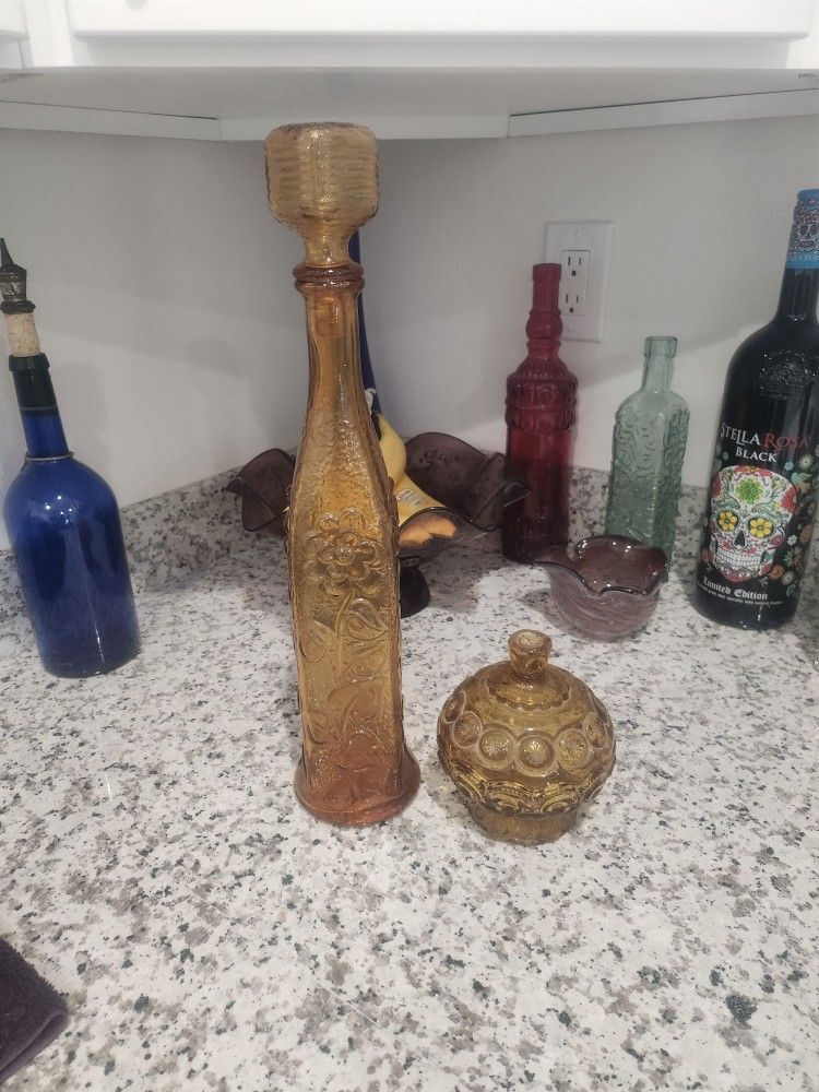 Amber glass candy dish, bottle with top