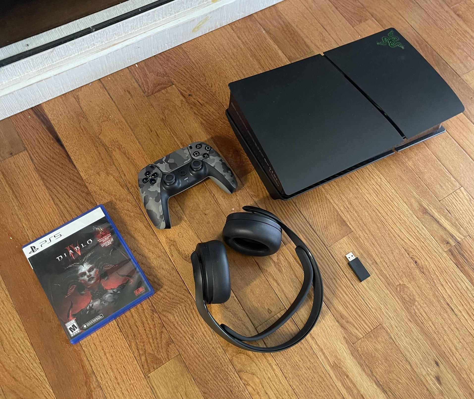 Ps5, headphone, controller and one game. Diablo 4. Brand new Matt black shield case. With razor logo.