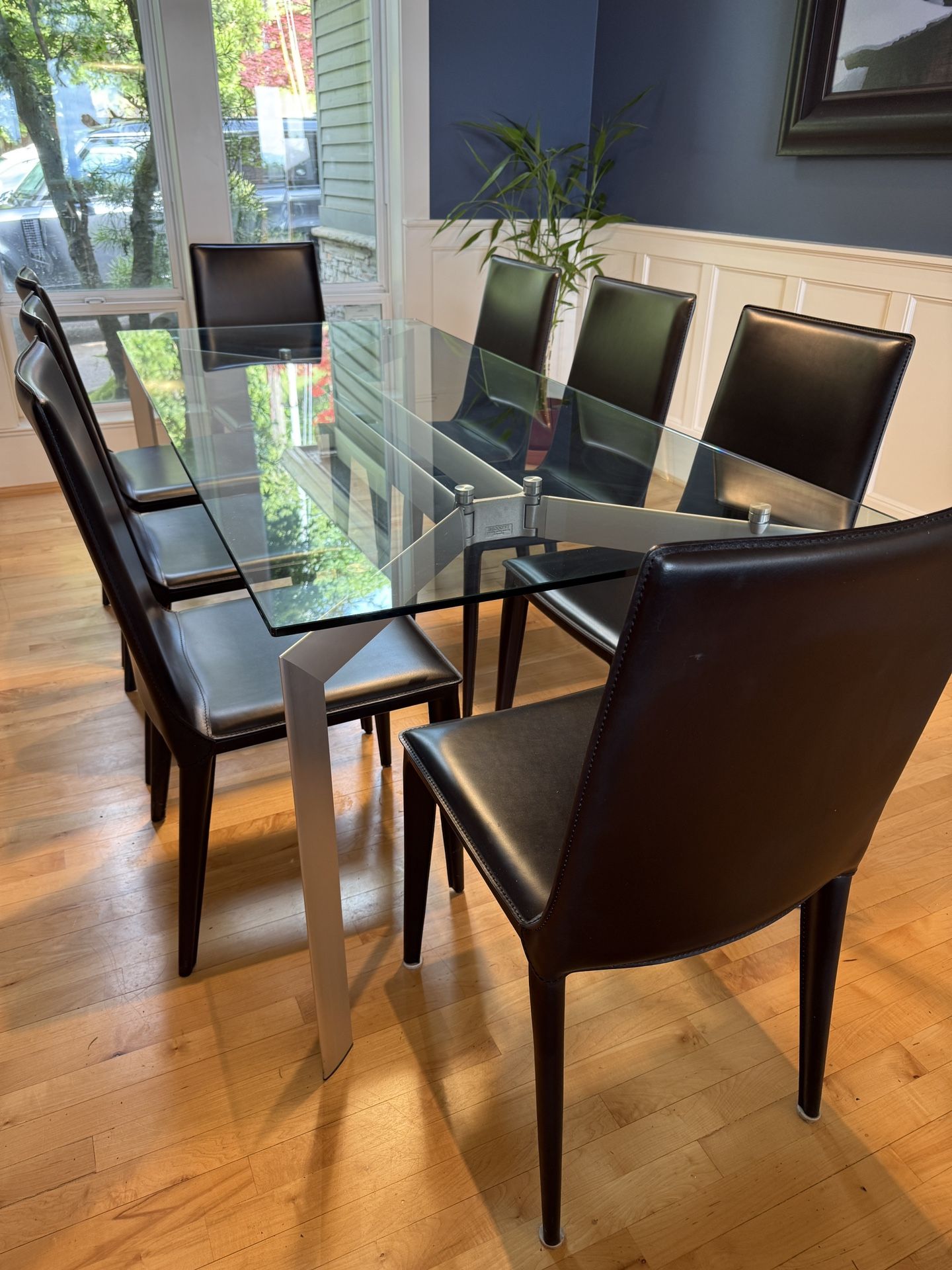 Modern Italian Glass Dining Table + 8 Black Leather Chairs – Designer Set by Seggose & Frag Elevate your dining space with this stunning contemporary Italian dining set in excellent condition. This high-end ensemble includes: • 1 Seggose Glass Dining Table • Dimensions: 78” L x 35” W • Sleek tempered glass top with brushed aluminum base • Minimalist yet elegant design, perfect for modern or transitional interiors • Stamped “Seggose – Designed & Made in Italy” • 8 Frag S.r.l. Leather Dining Chairs • 100% Italian leather, handcrafted in Pradamano, Italy • Sleek black upholstery with foam cushioning • Sturdy tapered legs and stitched detailing • Premium comfort and timeless style Condition: The entire set is in excellent, gently used condition. Glass is scratch-free, leather is supple and clean, and frames are solid. Original Retail Value: Over $8,000 Asking Price: $1,200 OBO (open to reasonable offers) Perfect for those who appreciate quality craftsmanship and modern European design. Located in Forest Heights neighborhood of Portland. Must pick up.