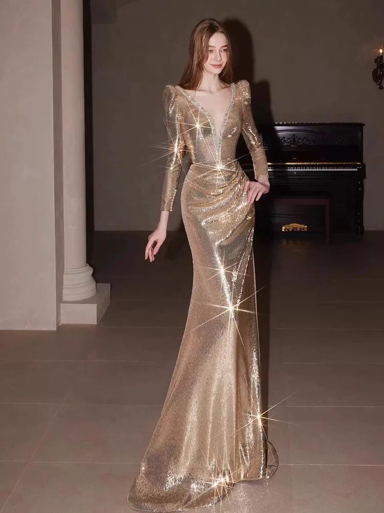 Selling a stunning gold sequin evening gown. This dress features a deep V neckline, structured shoulders, and a beautifully draped waist that enhances the figure. The full-length silhouette and train create a dramatic, elegant look that photographs beautifully. Perfect for: ✨ Formal events ✨ Weddings ✨ Galas ✨ Red-carpet style photoshoots ✨ Holiday or New Year parties I only wore it once for an event. Perfectly like-new condition with no flaws, loose sequins, or stains.